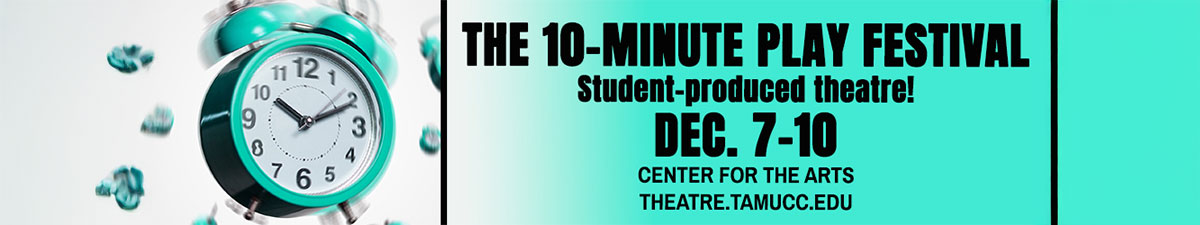 The festival will take place in the Wilson Theatre inside the Center for the Arts. Join us for a lively night of 10-minute plays directed, performed, and ran by TAMU-CC Theatre and Dance students. General Admission tickets are $13.50 and discounts are available for seniors 65+, students, and military. Tickets can be purchased at tamucc.tix.com or at the box office inside the Center for the Arts. For more information about ticketing, email boxoffice@tamucc.edu or call 361.825.5800.